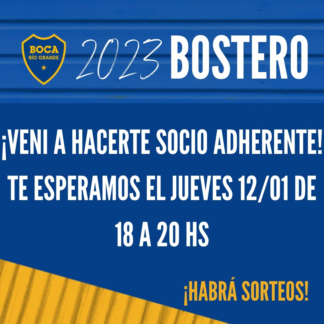 Este Jueves 12 de Enero la peña Boca Rio Grande invita a todos los simpatizantes de Boca Juniors que todavía no sean socios y quieran asociarse a la categoría socio adherente.