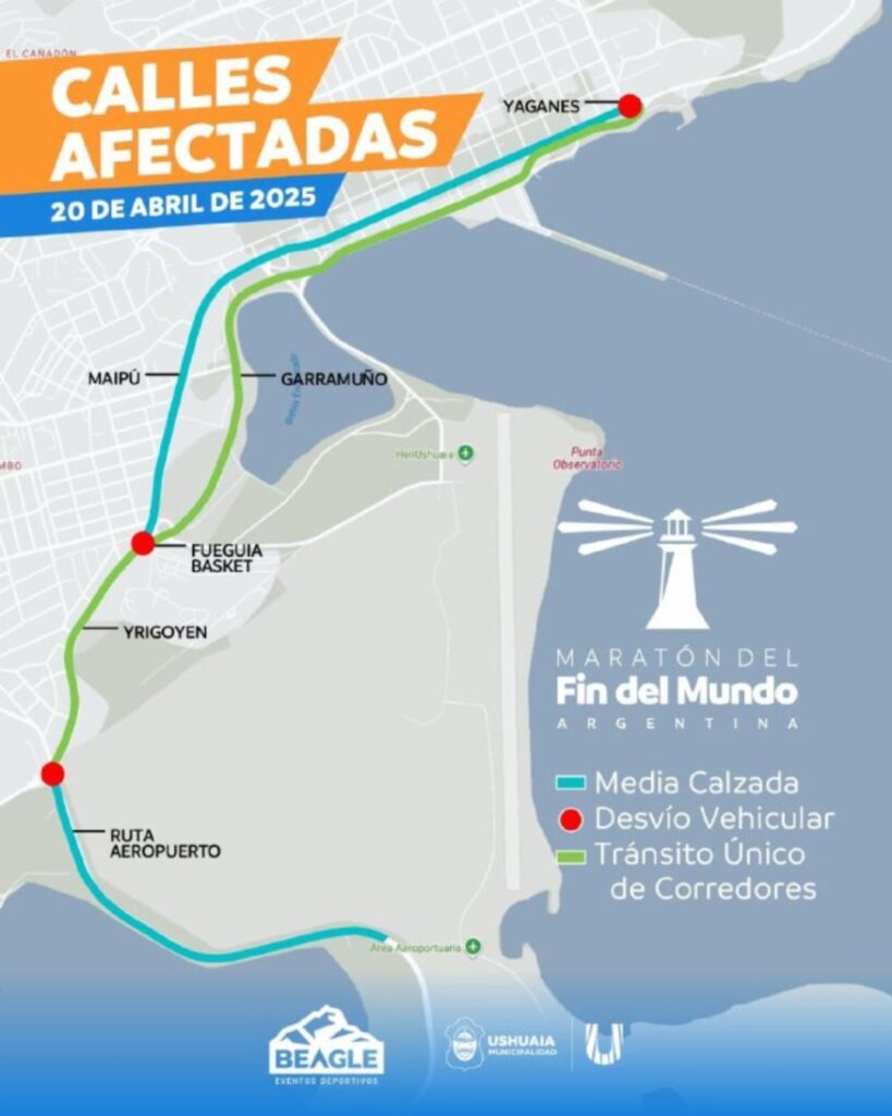 La Municipalidad de Ushuaia a través de la Dirección de Tránsito dependiente de la Secretaría de Gobierno informó que el domingo 20 de abril se llevará adelante la maratón Fin del Mundo, con lo cual se realizará el corte total de las avenidas Garramuño, Prefectura Naval e Hipólito Yrigoyen, mientras que en la Avenida Maipú habrá un carril especial. La interrupción será desde las 8 hasta las 14 horas aproximadamente.